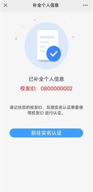 2. 补全个人信息页面填写完毕并提交后,会生成您的校友ID,请务必牢记您的校友ID,用于下一步实名认证。