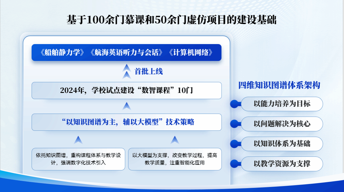 基于100余门慕课和50余门虚仿项目的建设基础,2024年学校试点建设“数智课程”10门,近日首批上线《船舶静力学》《航海英语听力与会话》《计算机网络》3门课程。课程建设采取了“以知识图谱为主,辅以大模型”技术策略,依托知识图谱,重构课程体系与教学设计,强调数字化技术引入;以大模型为支撑,改变教学过程,提高教学质量,注重智能化应用。从而构建了四维知识图谱体系架构,即“以能力培养为目标、以问题解决为核心、以知识体系为基础、以教学资源为支撑”。