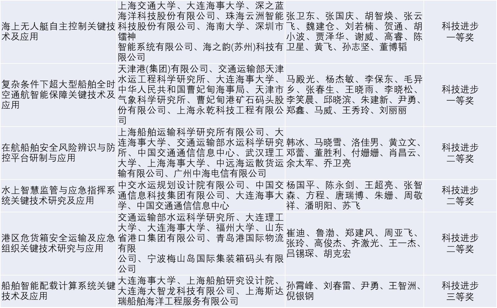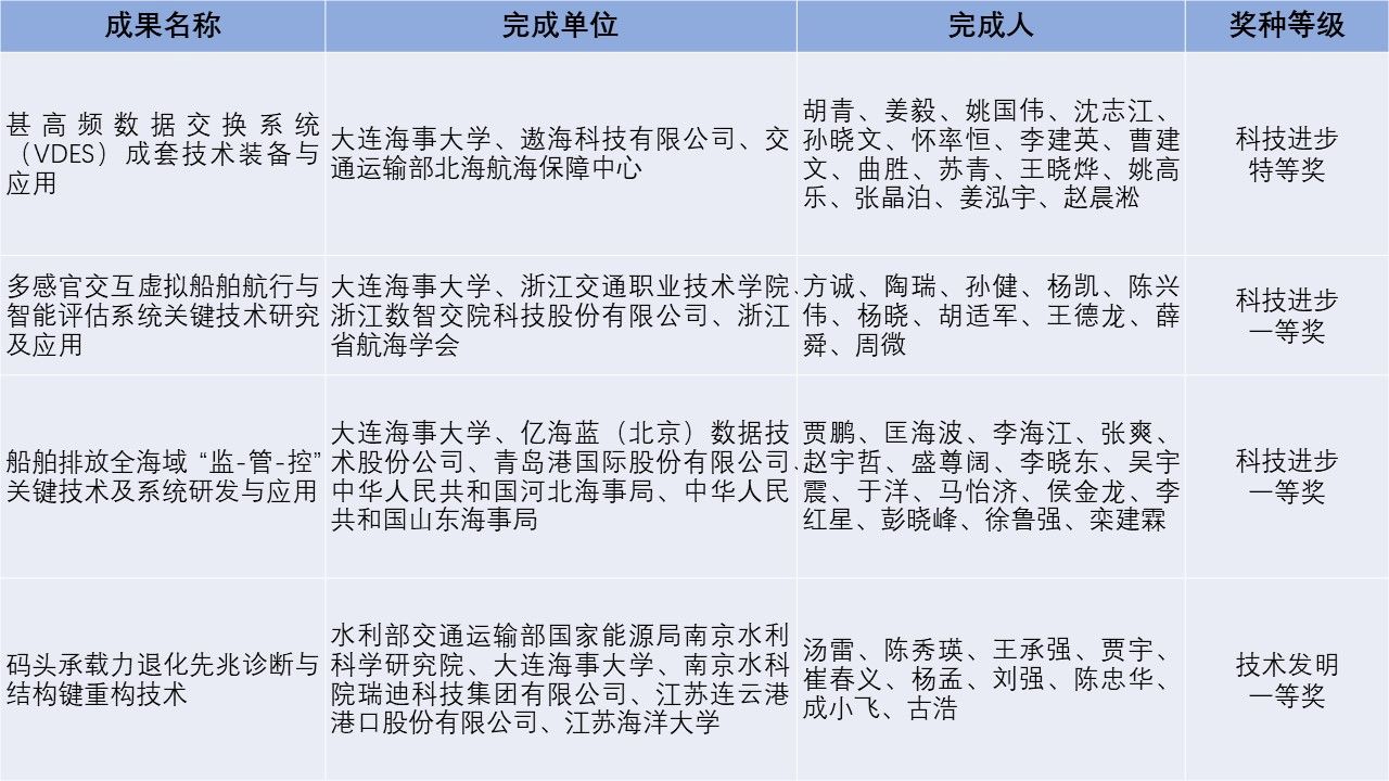 据悉,中国航海学会科学技术奖是由国家科学技术奖励工作办公室批准设立,面向我国航海领域的综合性科技奖项。2024年经中国航海学会科学技术奖励专业评审组和评审委员会评审,共评出85项获奖项目,其中科技进步奖特等奖2项、一等奖23项、二等奖35项、三等奖21项,技术发明奖一等奖3项、二等奖1项。