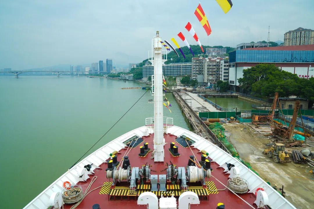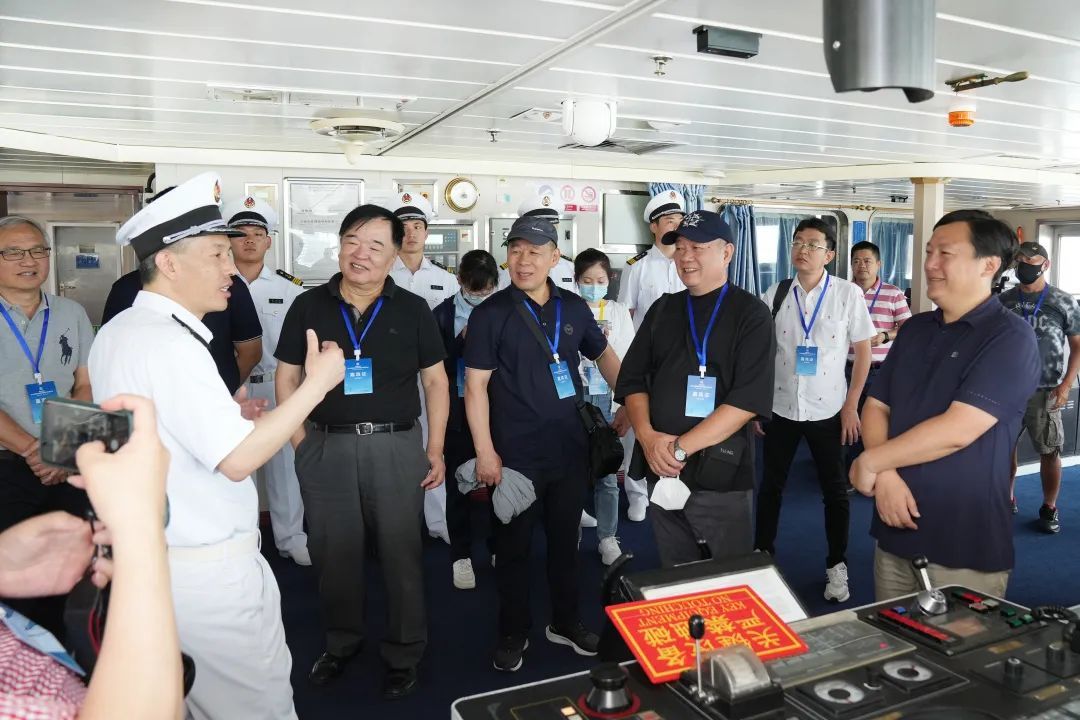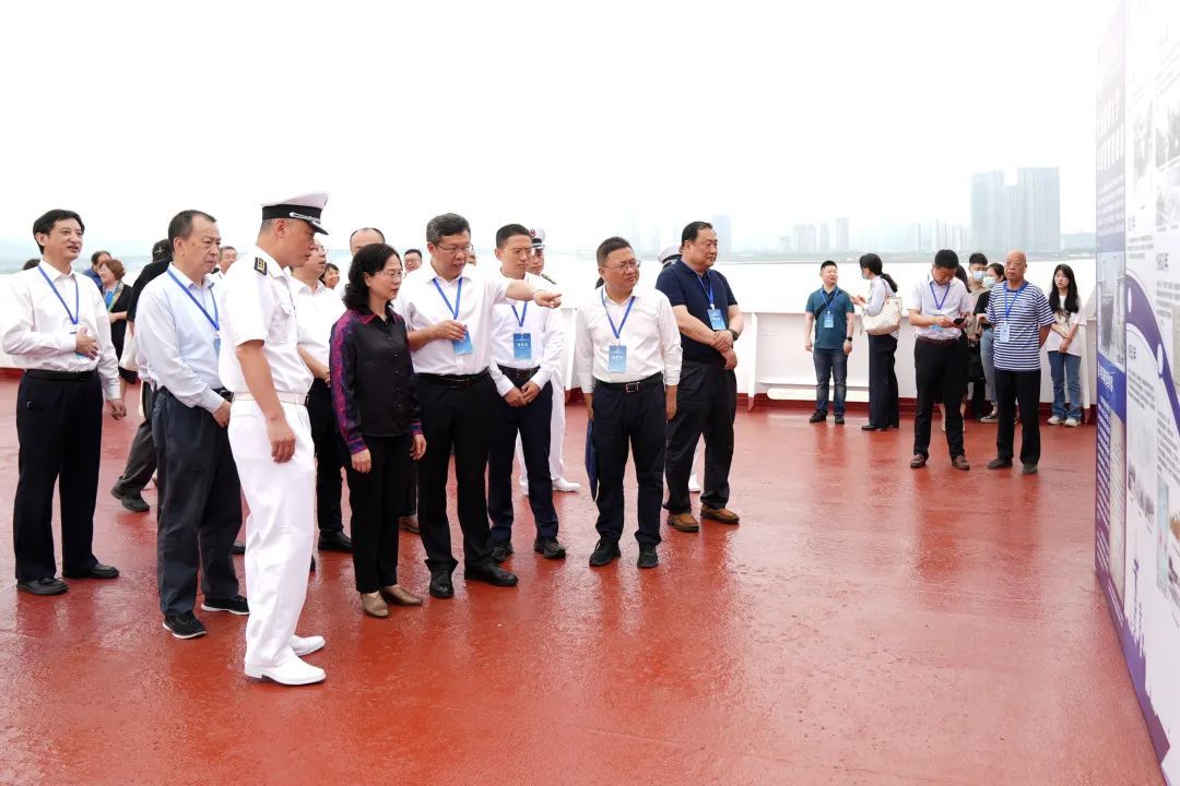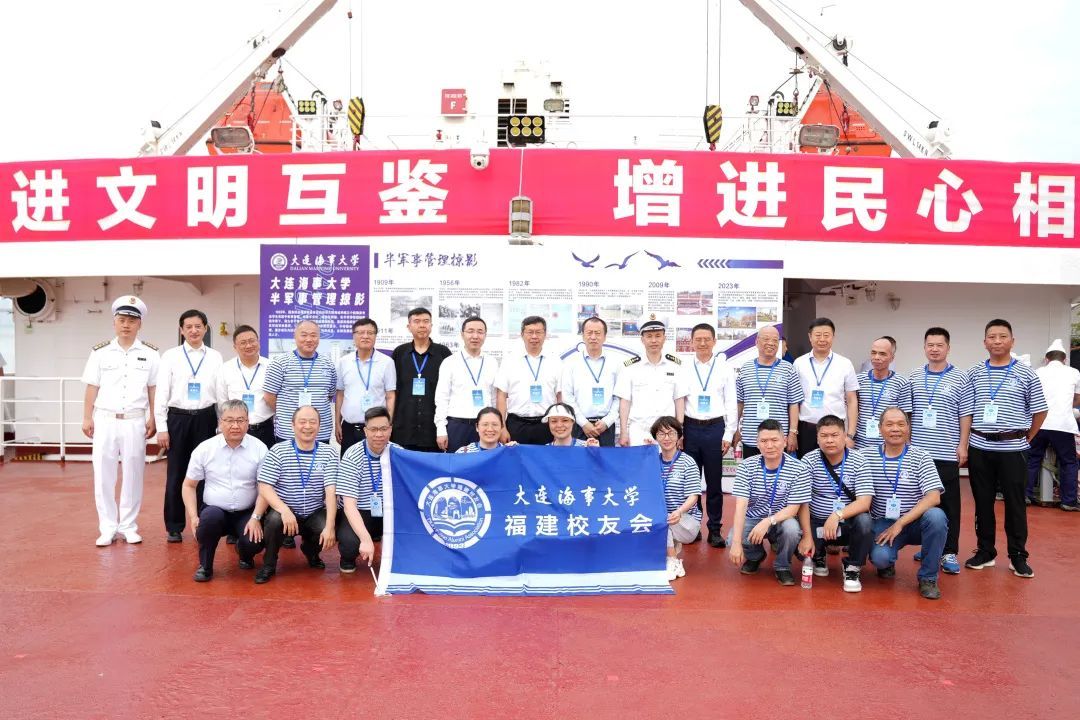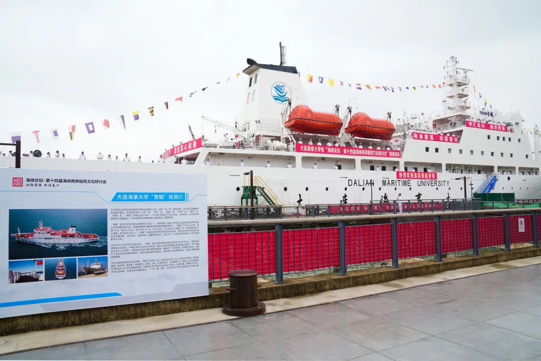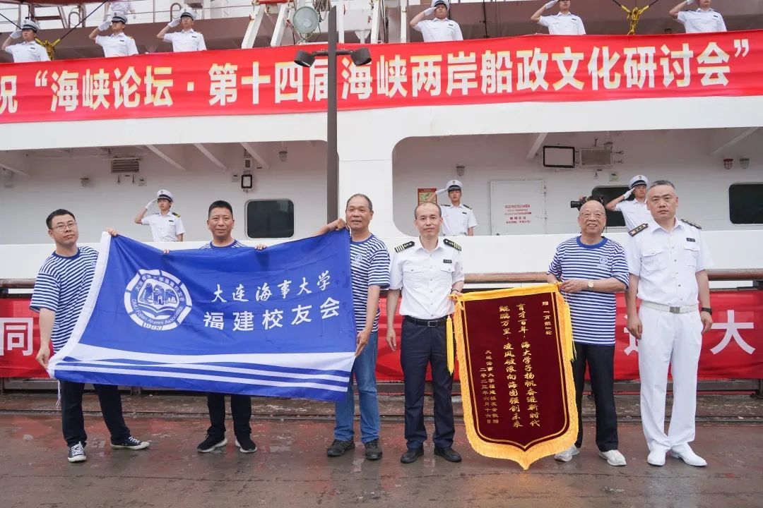 15日,“育鲲”轮到访欢迎仪式在位于福州市马尾区的中国船政文化城铁水坪码头举行,海峡两岸专家学者、船政后裔、大连海事大学福建校友会等嘉宾登船参观。
