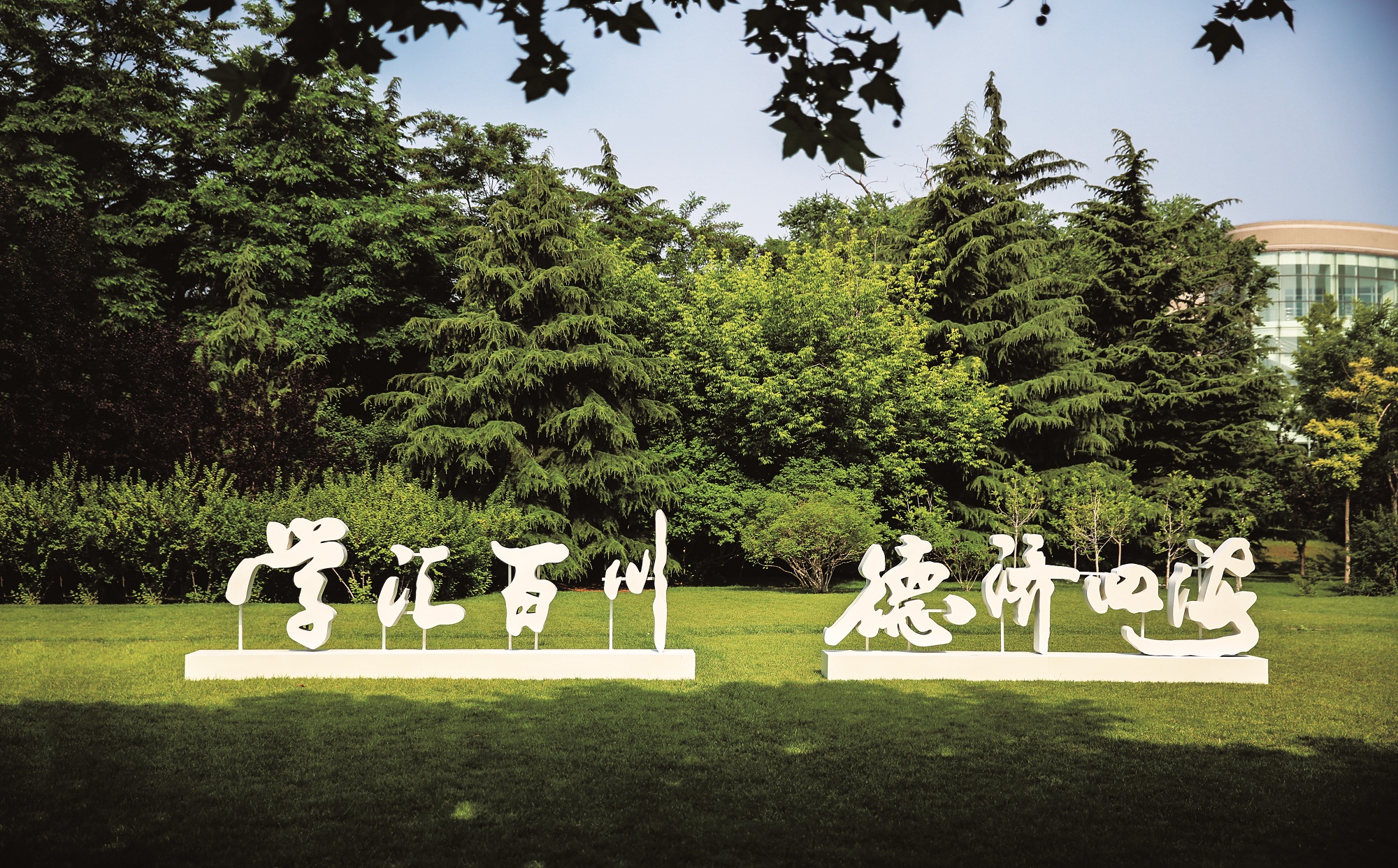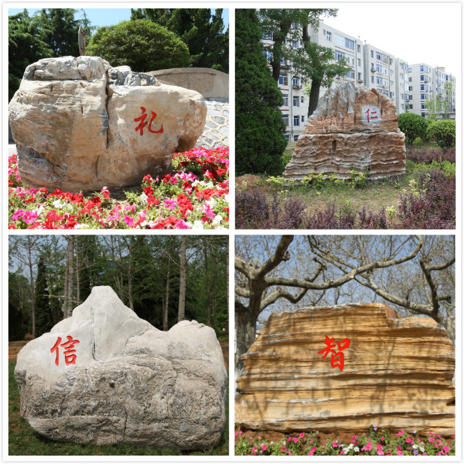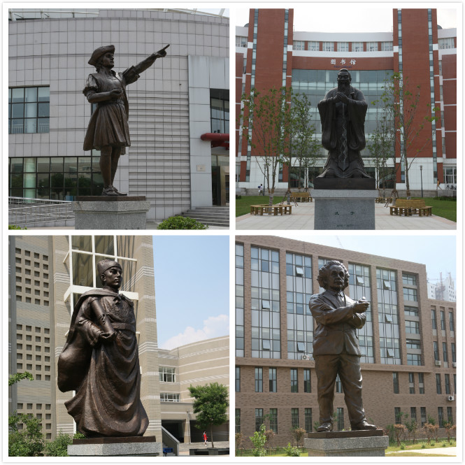 校园内随处可见的几十块篆刻着“仁义礼智信”等古训字雕的文化石寓意“尚德”,石之字,微言大义、寓意深邃;孔子、郑和、麦哲伦、爱因斯坦等15尊古今中外名人雕塑寓意“励志”,铜之雕,硕彦名儒,催人奋进。