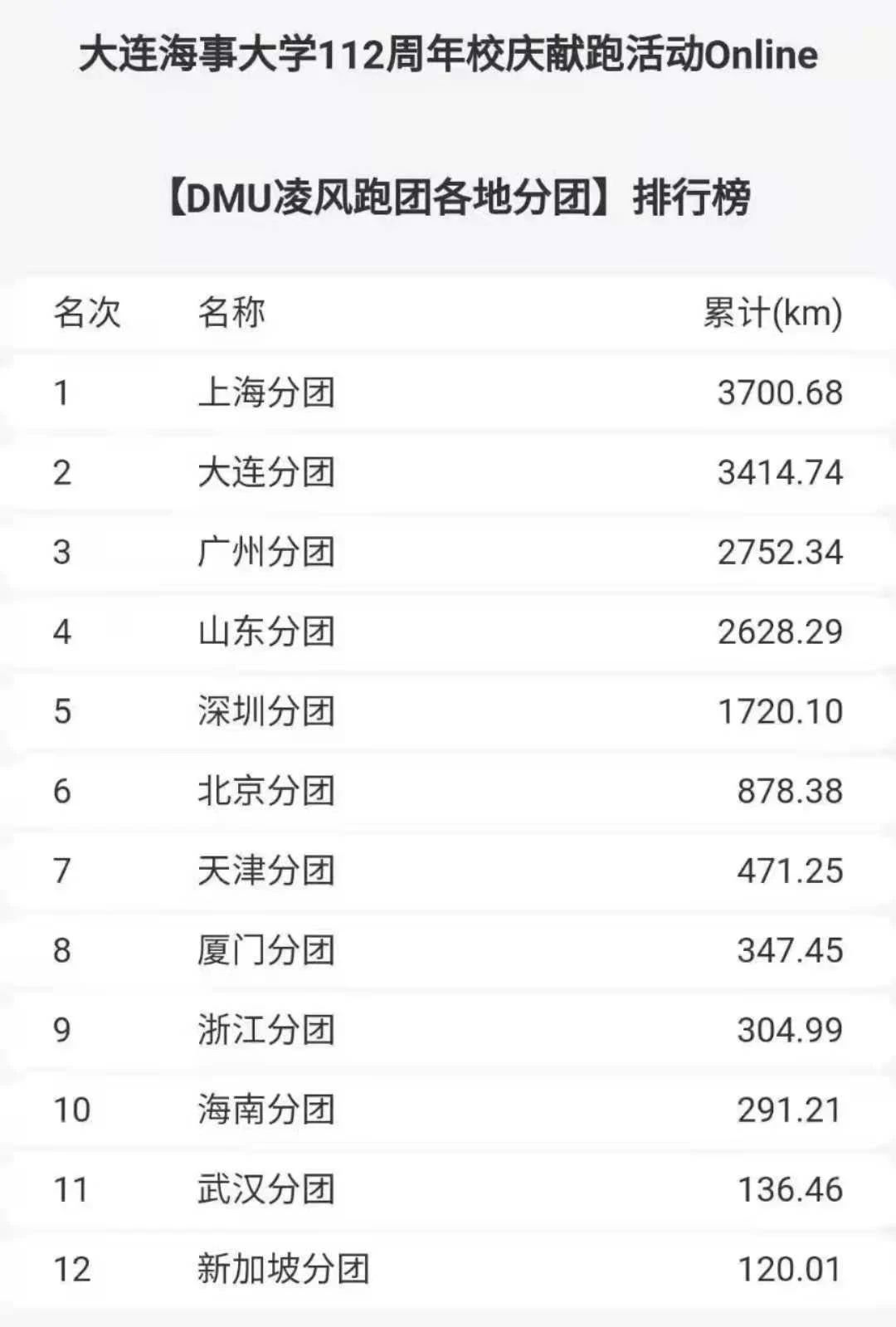 “我们奔跑,我们快乐,感谢命运让我们能与大连海事大学相识,非常荣幸成为您的学子,我无法想象她培育了多少英才,112年的历史长河中,它经历了多少风风雨雨才成就了今天,我们衷心祝愿母校112周岁生日快乐”。一名校友激动地说。此外,为了让全国各地的校友都能参与到112周年校庆接力跑的活动中,本届活动特别设置了线上跑活动,任何地方的校友均可通过报名线上活动,参与到分团接力赛中。参与接力赛的分团共有12个,分别是:大连、北京、天津、山东、上海、武汉、浙江、厦门、深圳、广州、海南、新加坡各地区分团。线上赛12个分团近300名校友齐参与,跑量合计16760余公里,最终各分团跑量累计排名如下: