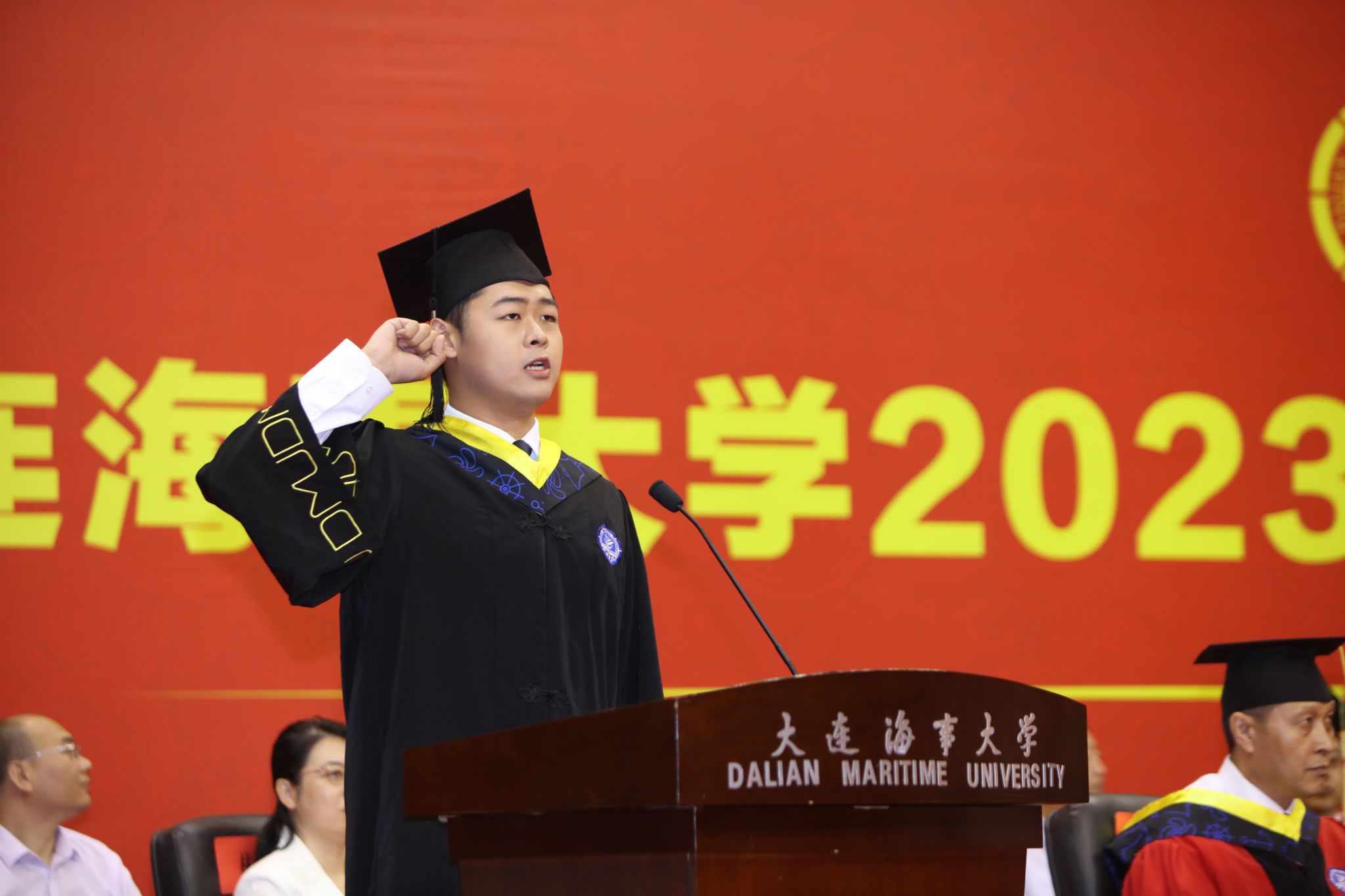 毕业生代表王植阳带领全体2023届毕业生庄严宣誓:“热爱祖国,热爱海洋;永念师恩,情系母校;奉献交通,追求卓越;复兴中华,德济天下。”