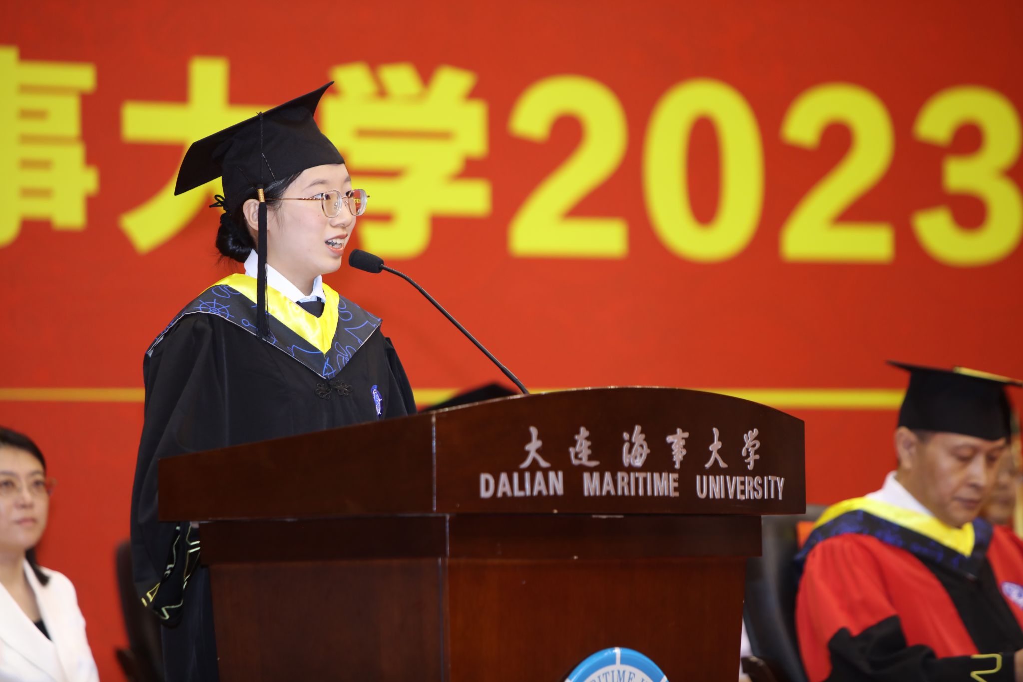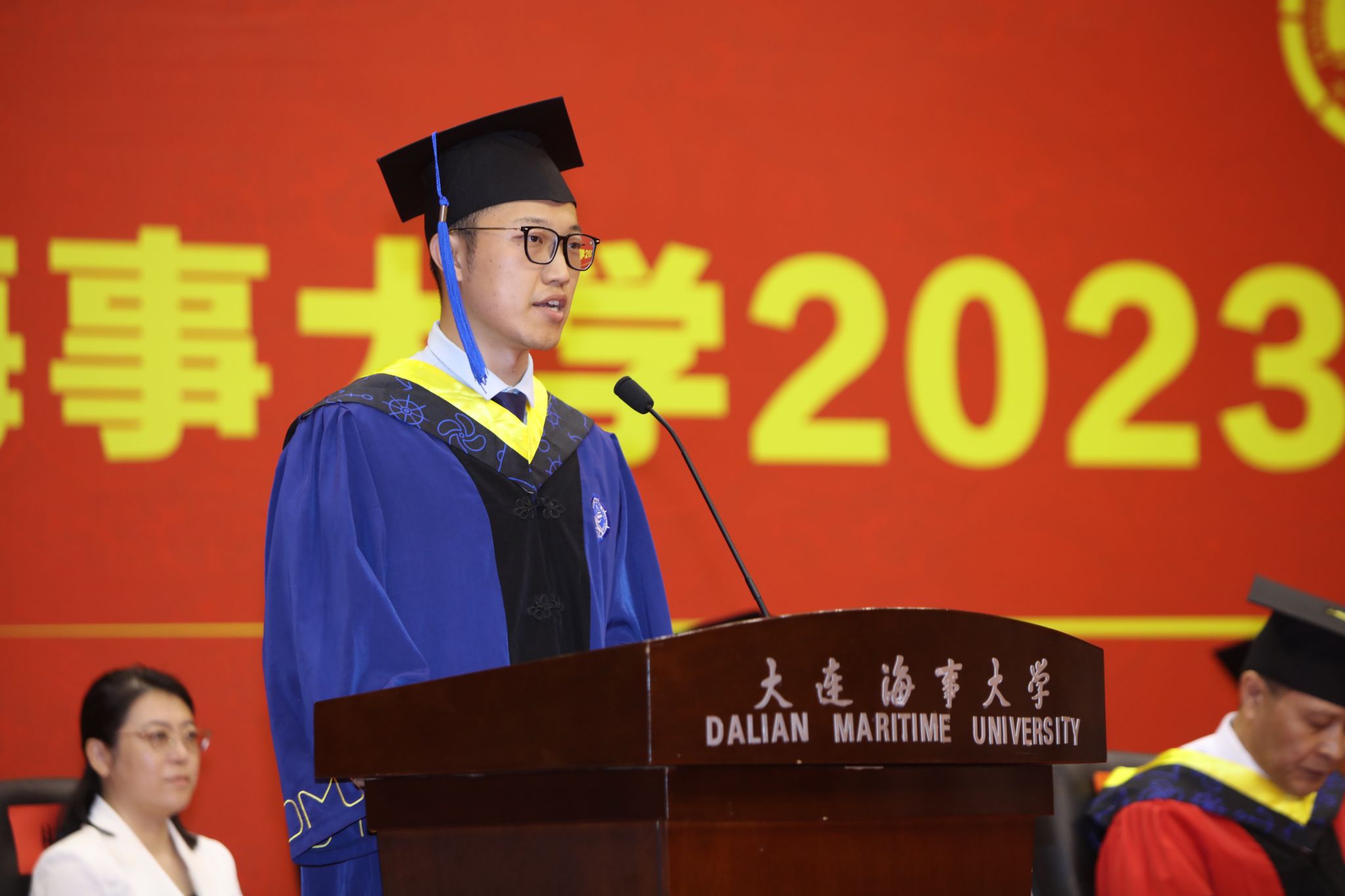 研究生代表孙浩男同学以“涓涓细流,汇入江海”“乘风破浪 踔厉奋发”“思源致远 笃行不怠”三个部分深情回顾了在海大的研究生生活,总结了成长收获,表示将坚持不懈地追求梦想,在实现中华民族伟大复兴的新征程上闪耀光芒。